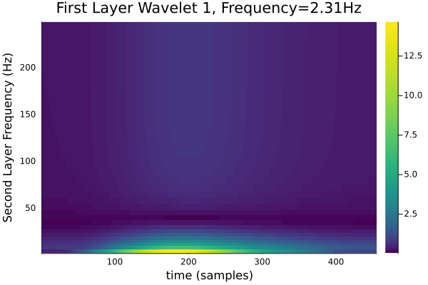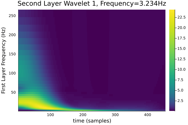 The second layer is where the scattering transform begins to get more involved, and reflects both the frequency of the envelope surrounding the signal and the frequency of the signal itself. With our plotting utilities, you can display the second layer with respect to specified wavelet paths from the first and second layer. After specifying the sf and St for your plot, provide an array of the desired wavelets from the first layer and an array of the desired wavelets from the second layer. To this end, lets make two gifs, the first with the first layer frequency varying with time:
